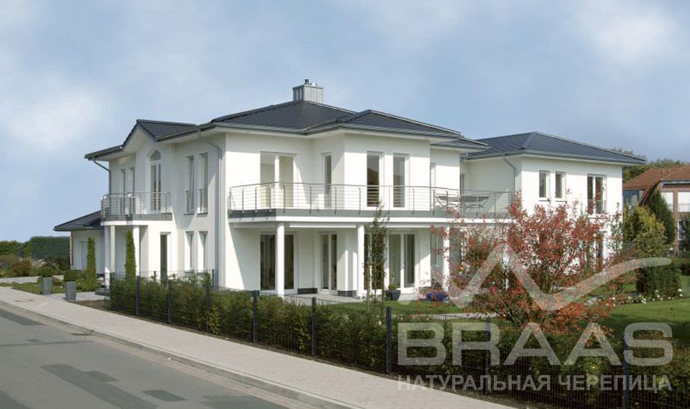 Пазовая натуральная черепица немецкой коллекции «Турмалин» от Braas станет достойным выбором для современного дома. Специальное покрытие, исключительно гладкая поверхность помогают сохранять кровлю чистой в любое время года. Со стороны готовая укладка выглядит как череда отполированных плит из камня. Наиболее эффектно смотрится эстетическое сочетание с фасадами в стиле High-Tech.