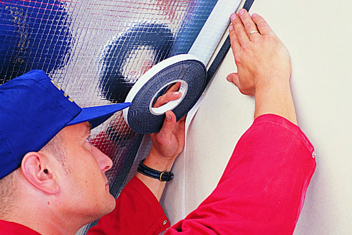 - Идеальный материал при выполнении примыканий к влажным стенам или покрытых инеем (лента предварительно наклеивается на плёнку и после прижимается к стене рейкой).